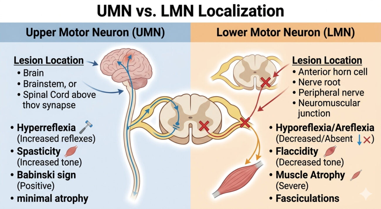 In clinical neurology, the physical examination is your most powerful diagnostic imaging tool. Before a patient ever enters an MRI scanner, a skilled clinician can pinpoint the exact location of a neurological deficit simply by wielding a reflex hammer and a tuning fork. For the junior doctor, mastering lesion localization is the fundamental rite of passage. The nervous system is a highly organized, topographical map; when a pathway is disrupted, it produces a highly specific constellation of physical signs. This comprehensive guide breaks down the critical distinctions between Upper Motor Neuron (UMN) and Lower Motor Neuron (LMN) lesions, while also navigating the complex clinical presentations of cerebellar and basal ganglia syndromes. By mastering these patterns, you transition from simply observing symptoms to definitively mapping the neuroaxis.